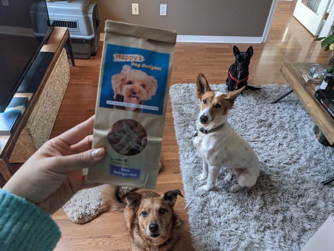 Taffy and Dryfuss enjoying their Happy's Dog Delgiths Treats. They both LOVE, LOVE them!! Thank you Mimi they are so yummy!! xoxo